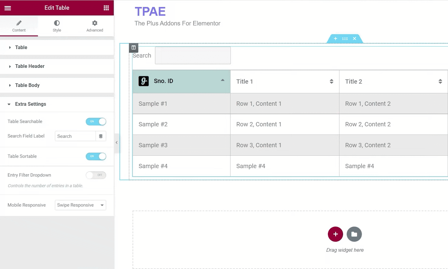 - Extra Settings: These settings include advanced features that improve the user experience of your tables and add advanced tabular comparison options. You can create searchable tables with a simple toggle. You also add a sorting option to your tables. Besides you can also add an entry filter dropdown menu to limit the number of visible rows, making this the best table plugin for Elementor.