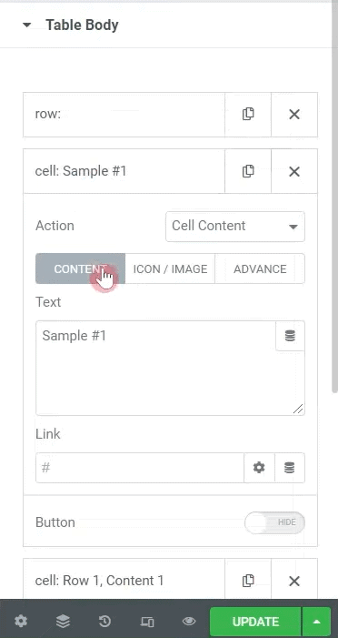 - Table Body Options: Similar to the header option, you get granular control over your table’s body. You can add new rows and set content for each cell. Besides, you can also add buttons and links to the table and customize the look and feel of each cell.