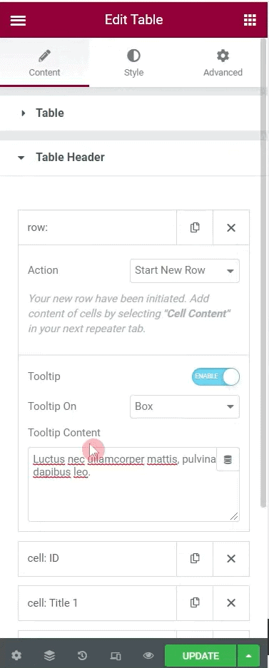 - Table Header Options: Next, you get comprehensive table header options. You can add new rows or individual cell items, rename the header, add icons and tooltip text, customize the background color, and more.