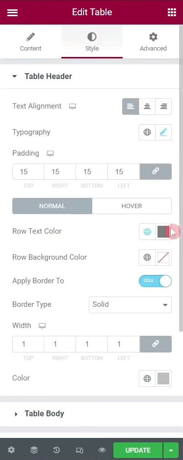 - Table Styling Options: You get ample customization options, including text alignment, typography, padding, text and background color, border, etc., for both header and the body. You can even add images, icons, and box shadows and customize the search bar in Elementor’s style tab.