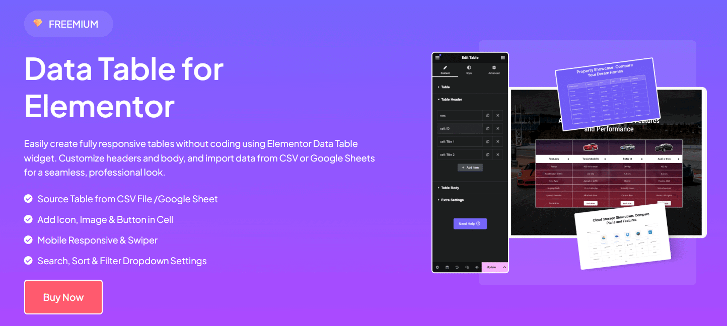 The free version of Ninja tables Elementor plugin includes features like unlimited rows, table customizations, sorting and filtering, buttons, ratings, etc. You can also use prebuilt templates to create functioning tables quickly.