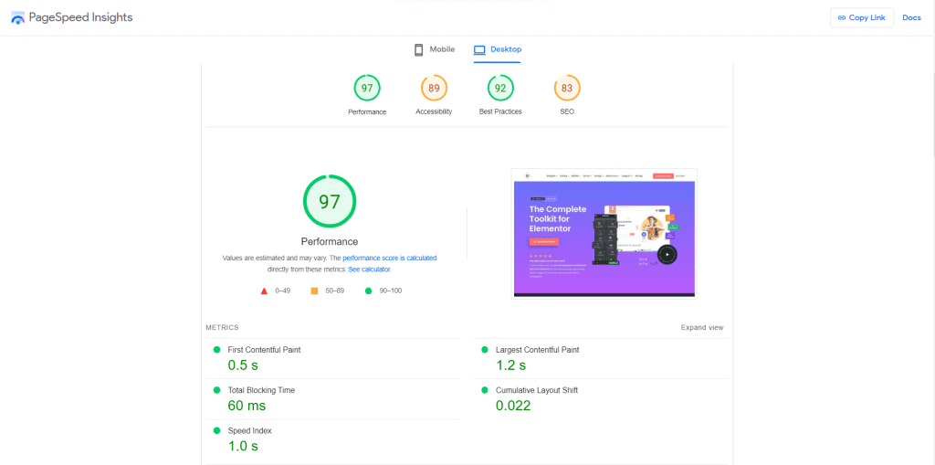 Here is a screenshot of the PageSpeed test for The Plus Addons for Elementor website. Despite being resource-intensive, the website achieves exceptional speed scores, largely due to the free Unused Widget Scanner feature:
