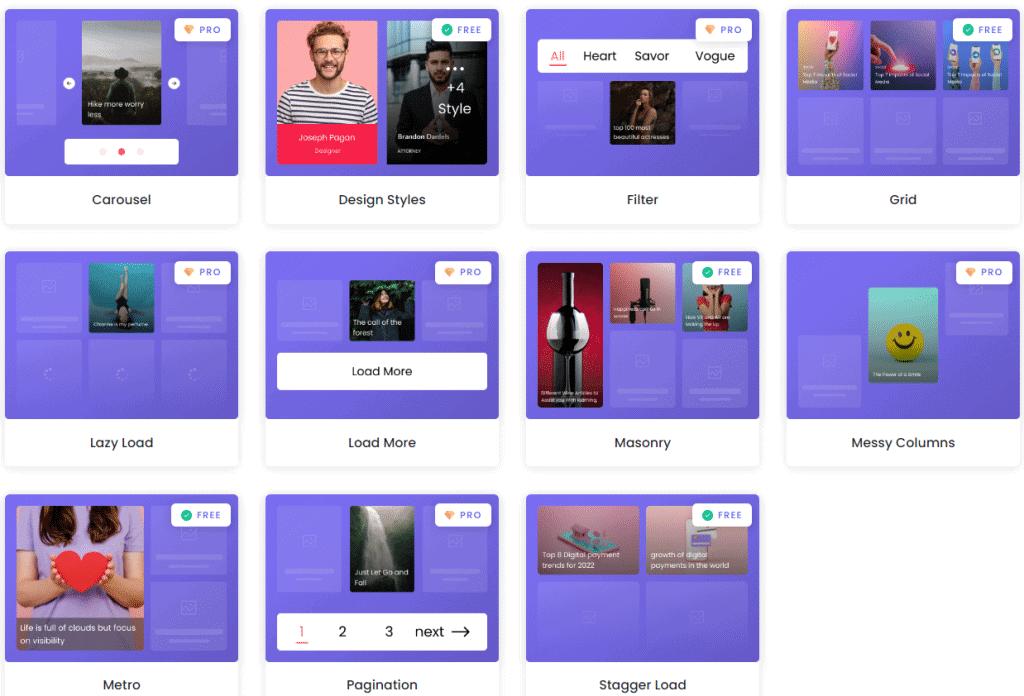 The Plus Listings collection is tailored for listing content like blogs and images on your website. This free collection gives you access to listing layouts like Grid, Masonry, Metro, and Stagger Load.