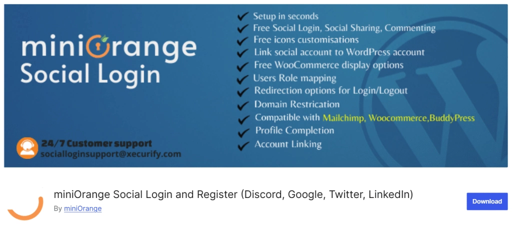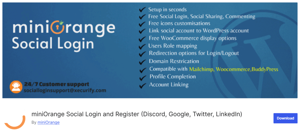 miniOrange Social Login and Register lets you add social login options to your WordPress website.