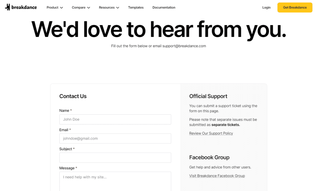With Breakdance, you can connect with their customer support team by filling out a contact form. The support team will get back to you to help resolve the issue.