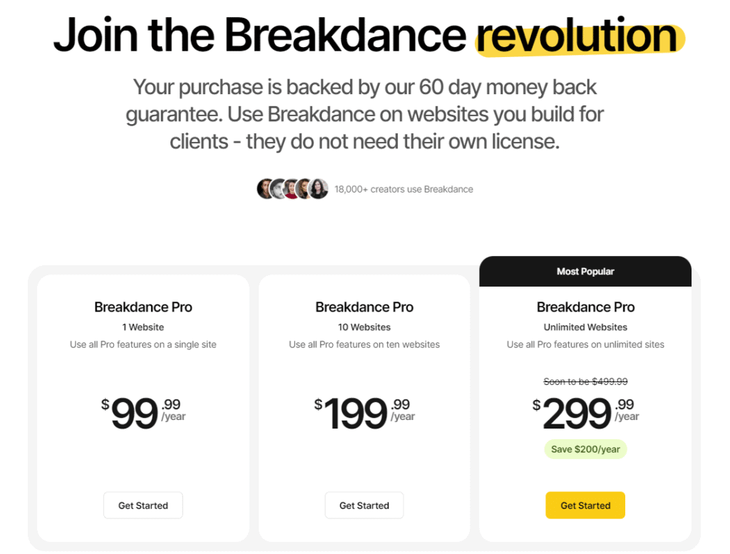 - Breakdance Pro for unlimited websites at $299.99/year