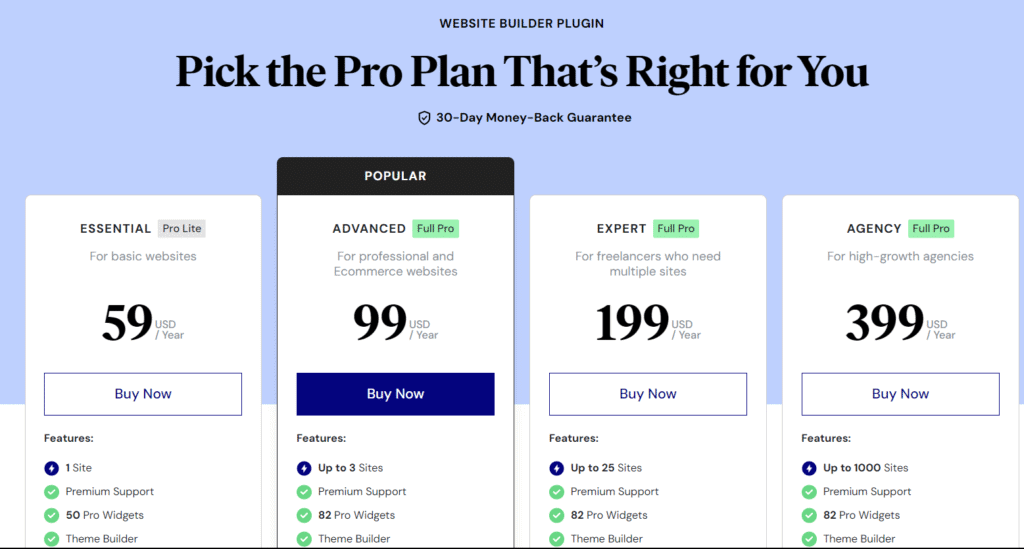 - Agency plan at $399/year with 82 Pro widgets for up to 1000 websites