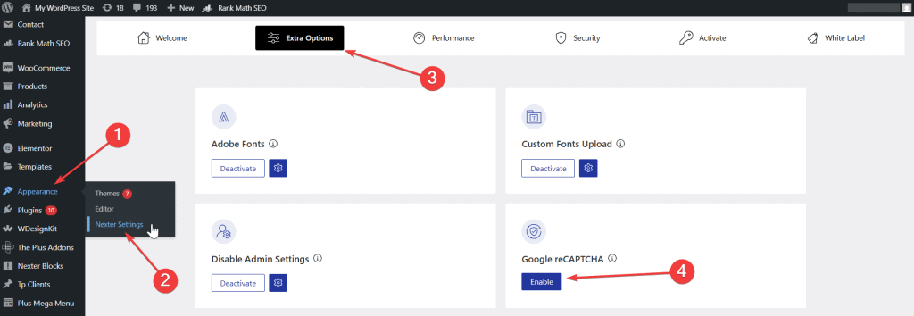 Step. 7 After installing the Nexter Extension plugin navigate to Appearance > Nexter Settings > Extra Options and enable the Google reCAPTCHA option.