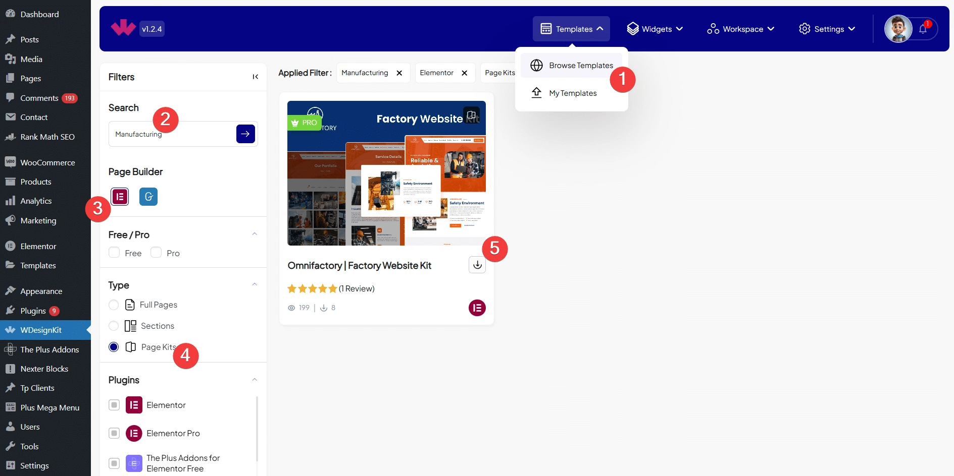 Type Manufacturing in the search bar, then narrow things down by selecting Elementor from the page builder filter and Page Kits as your template type.