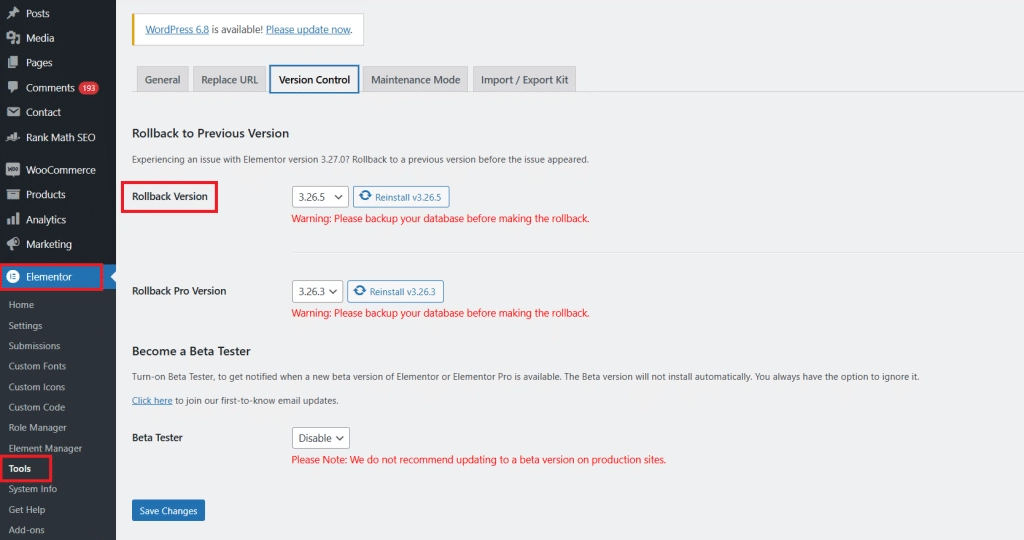 - Navigate to Elementor > Tools and find the Version Control tab.
