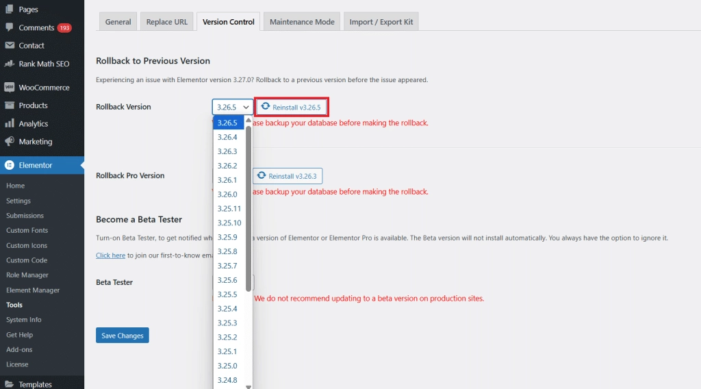 If Elementor changes are not showing after the update and you don’t have a recent website backup, you can also revert to the previous version of Elementor.