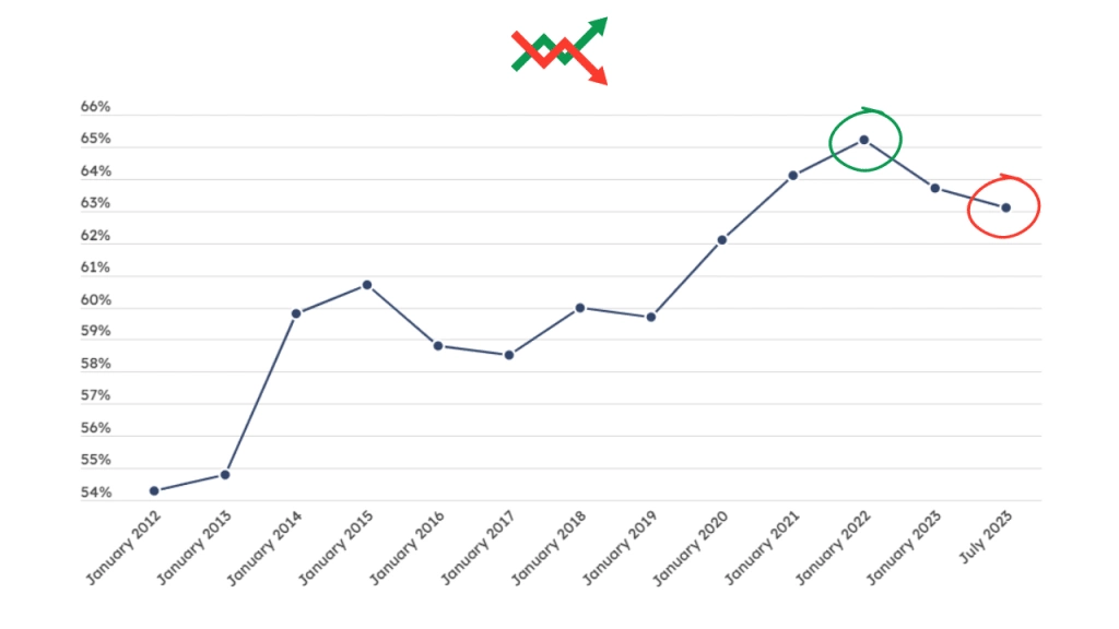 According to one source, WordPress’ market share among websites with known CMS declined from an all-time high of 65.2% in January 2022 to 63.1% in July 2023.