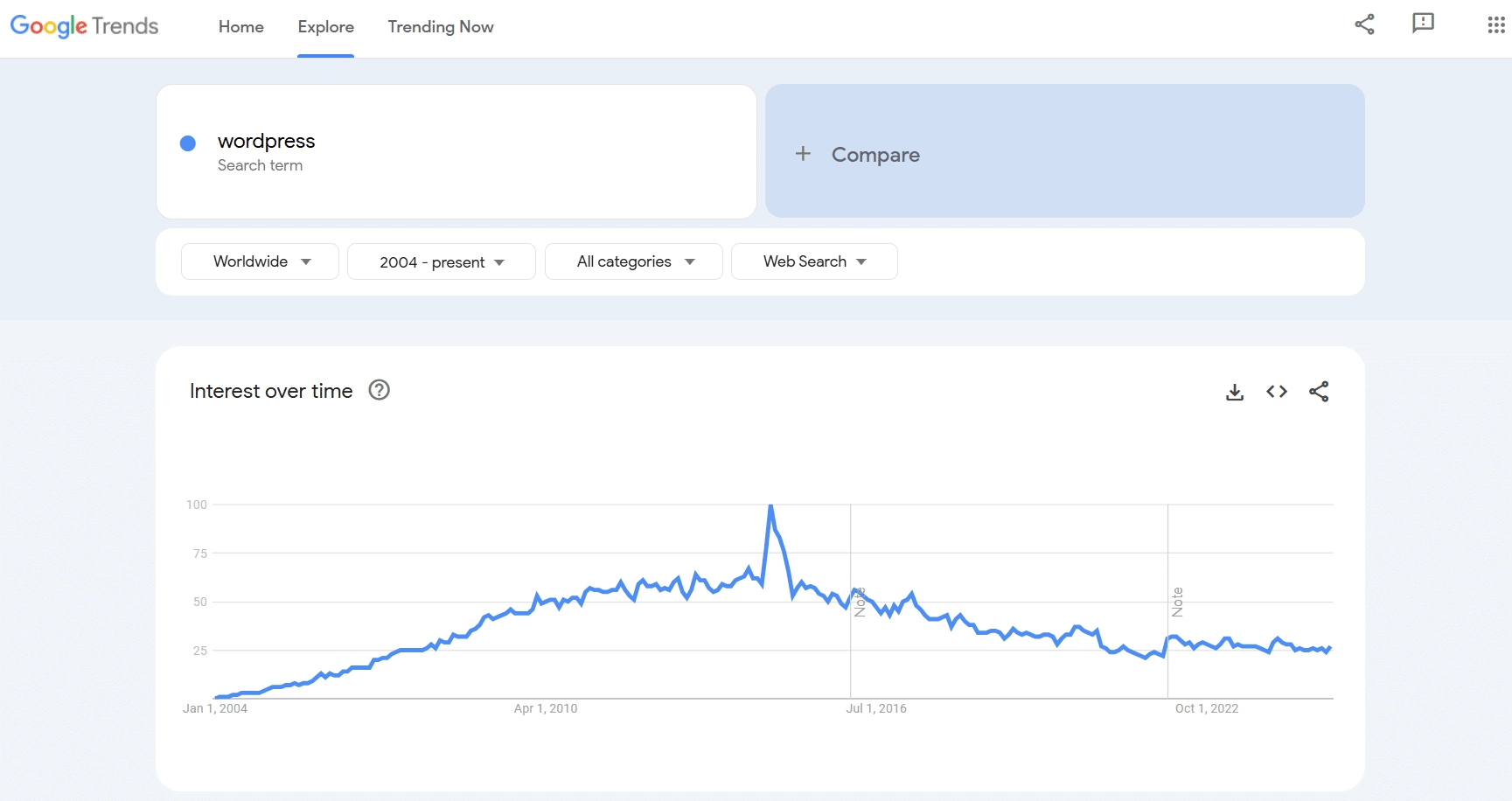 According to Google Trends, You can see that after 2014-15 around, not many people have been searching for ‘WordPress’, the number has declined since those years. Because, now some of the newer platforms like Shopify, Wix, and Squarespace exist in the market and also gaining good traction.