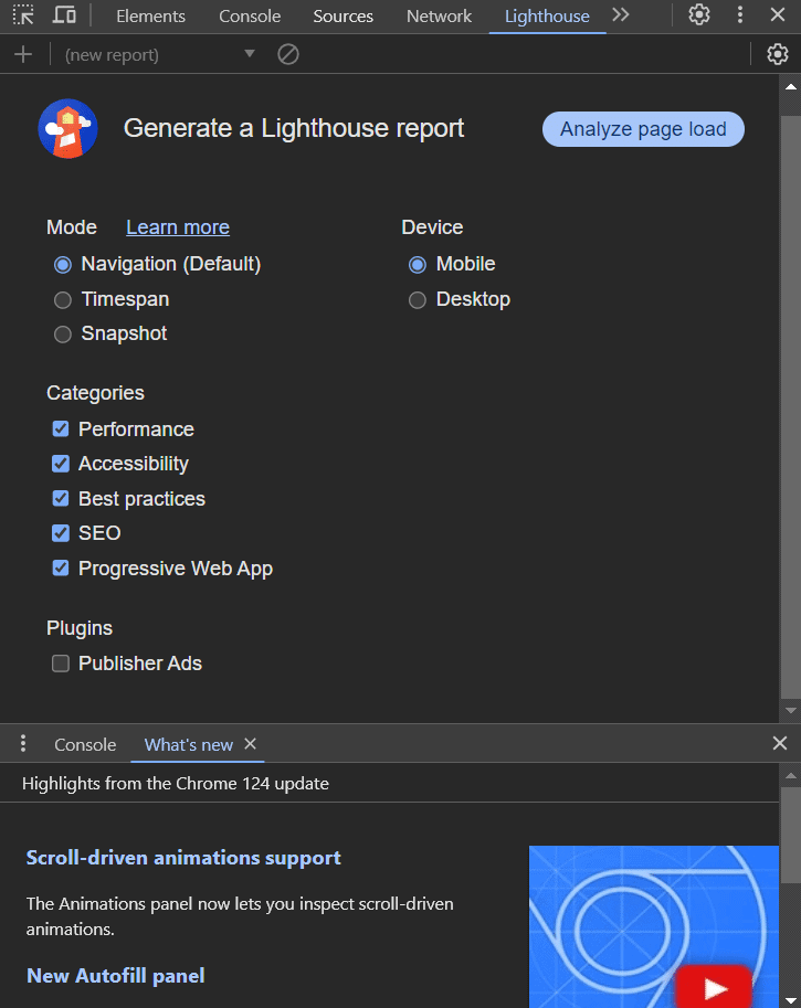 If you’re accessing WordPress on Google Chrome, go to the Performance tab under Developer tools and click on Lighthouse. This will offer insights like loading times, network activity, and resource requests.