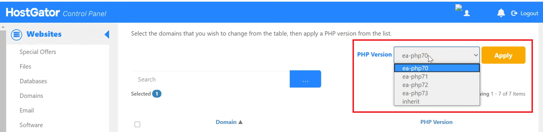 - Select the checkbox for the website or domain you want to access the PHP settings for
