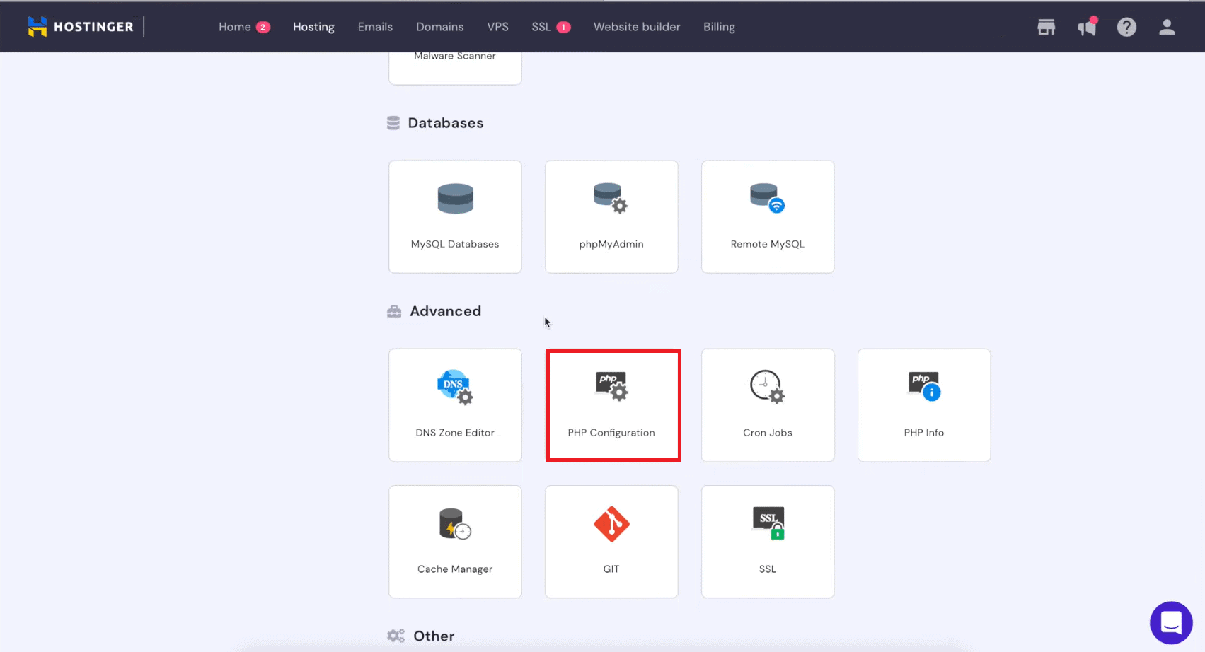 For instance, here’s what it looks like for websites using Hostinger. Go to PHP Configuration section.