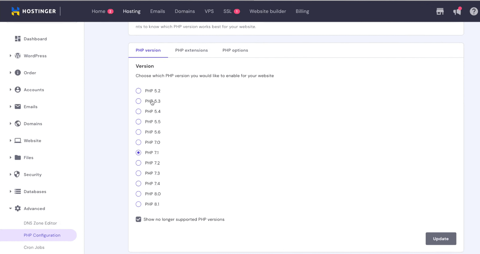 If you have access to your web hosting server’s dashboard, you can view and update the PHP version.
