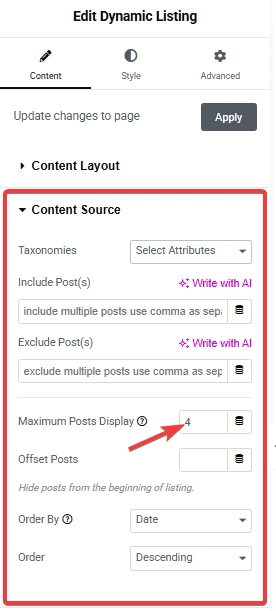 4. Now go to the Content Source tab and set the maximum number of posts to be displayed on a page in the Maximum Posts Display field.