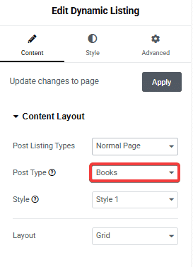 2. Select the appropriate listing type from the Post Listing Types dropdown and select your custom post type from the Post Type dropdown then select the appropriate style and layout.
