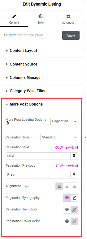 You can align the pagination, you can also manage the pagination typography, color and hover color from here.