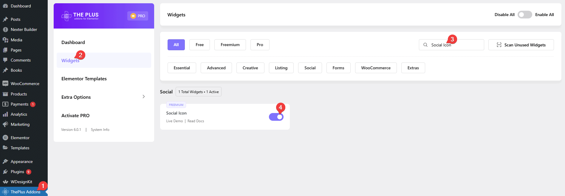 - Make sure the Social Icon widget is activated. To verify this, visit The Plus Addons → Widgets → and search for Social Icon and activate.