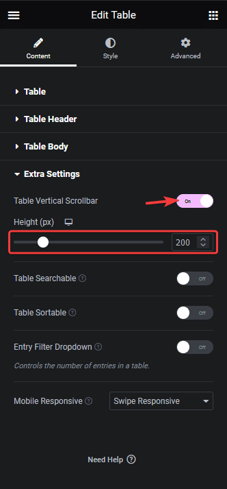 To do this, add the widget on the page, once you’ve added content to your table, go to the Extra Options tab > Table Vertical Scrollbar and turn on the toggle.