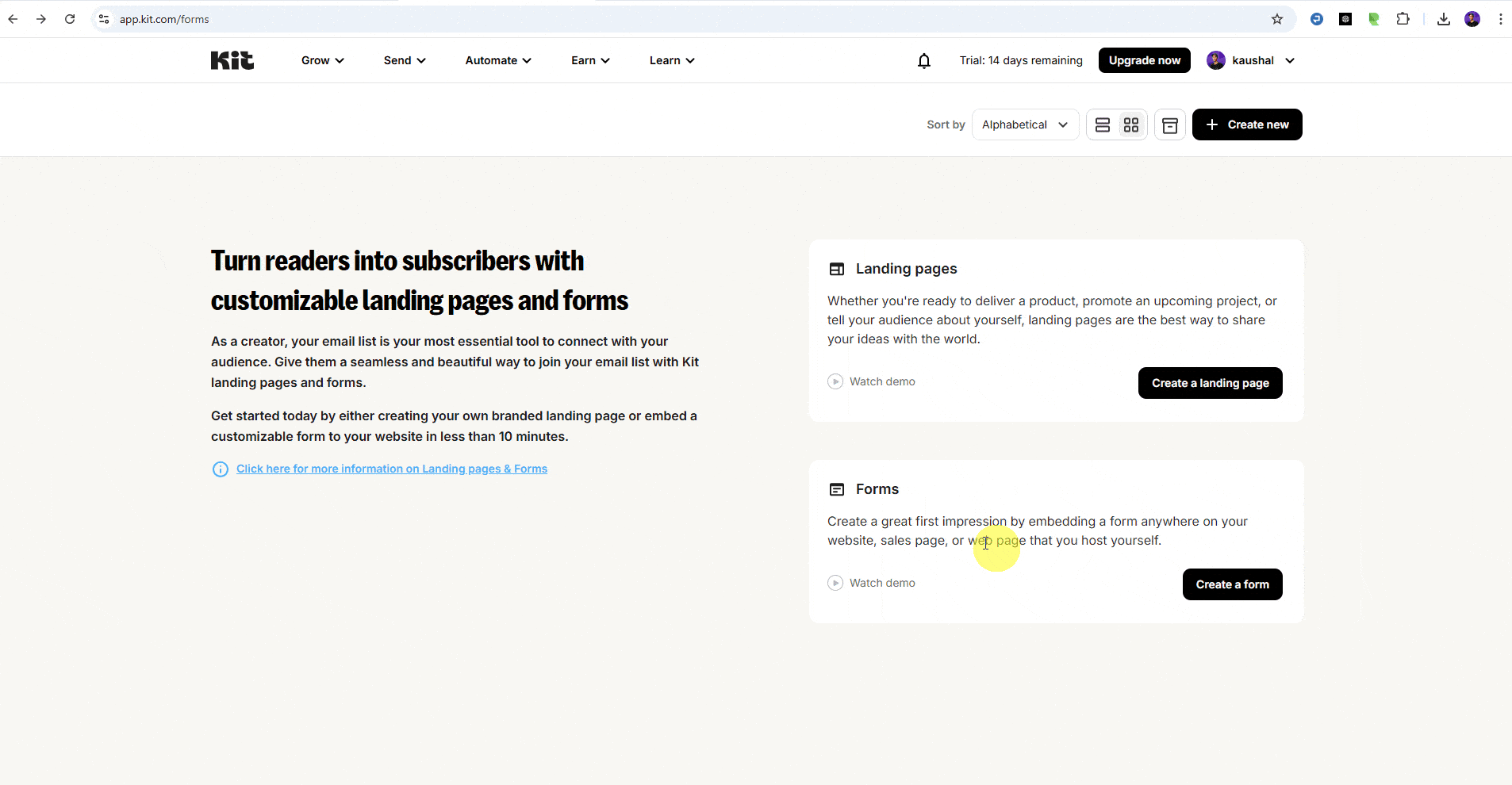 1. From the Kit (formerly ConvertKit) dashboard, go to Grow > Landing Page & Forms.