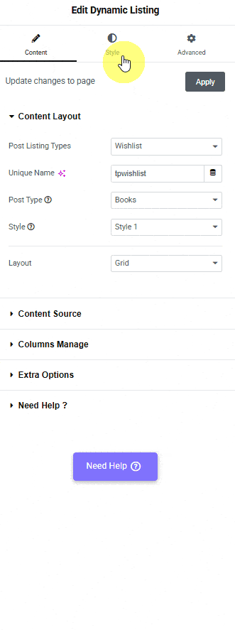 To do this add the Dynamic Listing widget to the page where you want to show the wishlist, then follow the steps –