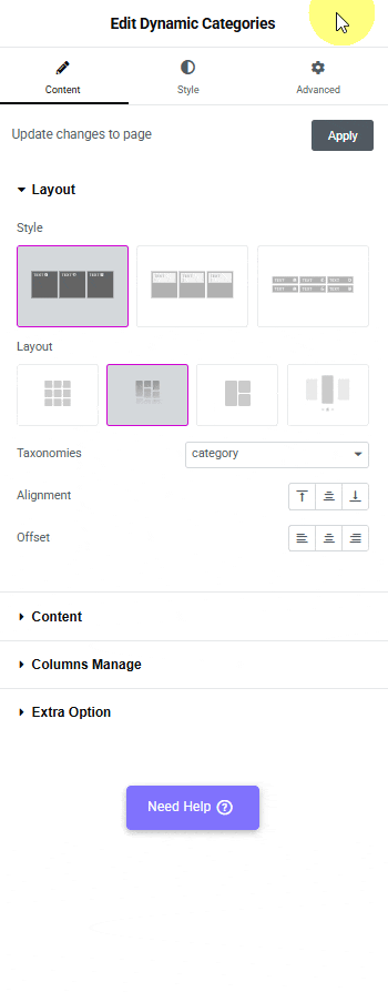 1. Add the Dynamic Categories widget on a page and select an appropriate style from the Style section from the Content Layout tab.