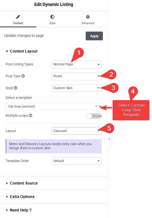 Now your post with custom loop skin will show in a carousel slider. You can manage the carousel from the Style > Carousel Options tab.