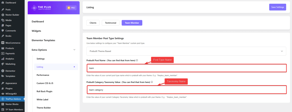 Under the Team Member Post Type Settings section, From the dropdown, select ThePlus Post Type.