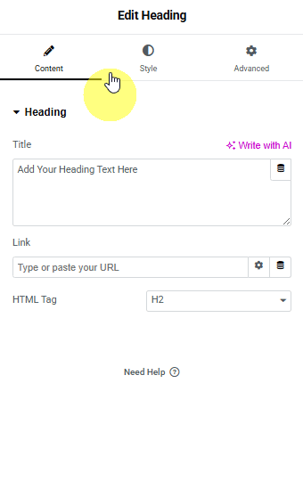 3. Then, to add the title, we’ll use the Elementor Heading widget in the middle column.