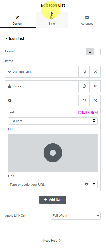5. In the last column, we’ll add the Elementor Icon List widget. As per our design, we’ll add some coupon information like Verified Code, Users, and the coupon validity date.