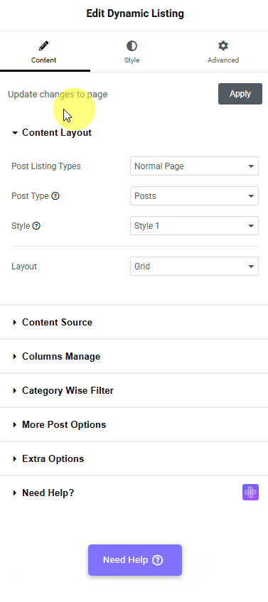 1. Add the Dynamic Listing widget on a page or template.