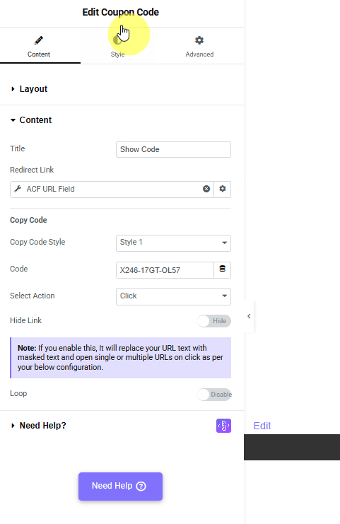 For this, click on the Dynamic Tags in the Code field and select ACF Field under ACF. On the next screen, click on the ACF Field again and select Code from the Key dropdown in the Settings popup.
