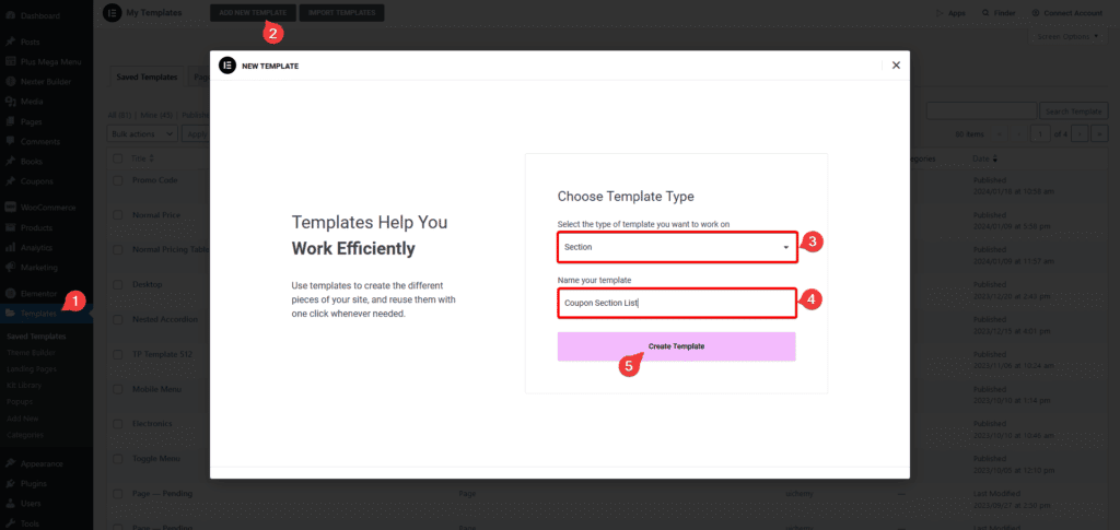 1. To do this from the Dashboard, go to Templates and click on Add New, then select Section as the template type, give a name to the template then click on the Create Template button.