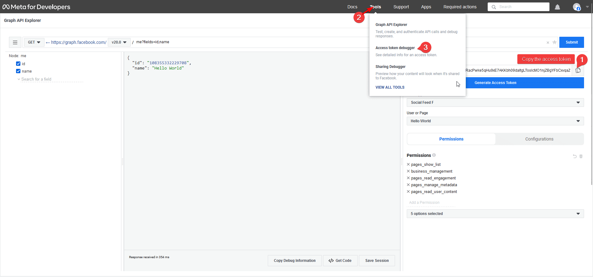 17. Now the generated token key is a temporary one (will expire in about 2 hours from generation), to extend it for 2 months, copy the access token and from the top menu go to Tool > Access token debugger.