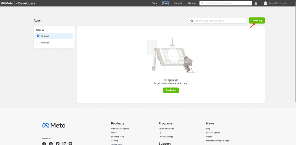 4. Once done, you’ll get to the Apps page, and click on the Create App button.
