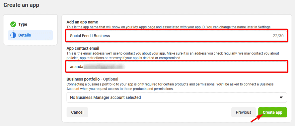 8. Then add an app name, email id and optionally connect your business account. Once done click on the Create App button, it will ask for your password to authenticate.