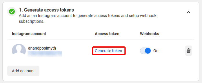 15. On the next page, click on the Add account button under the Generate access tokens section.