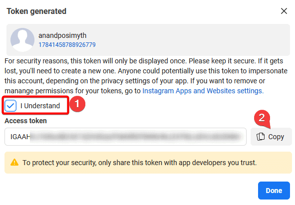 19. Then you’ll see the Token generated popup, check the I understand checkbox to see the token, and click the Copy button to copy the token key.