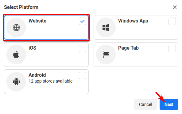 11. It will open a popup, then select Website as the platform, and click on the Next button.