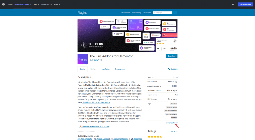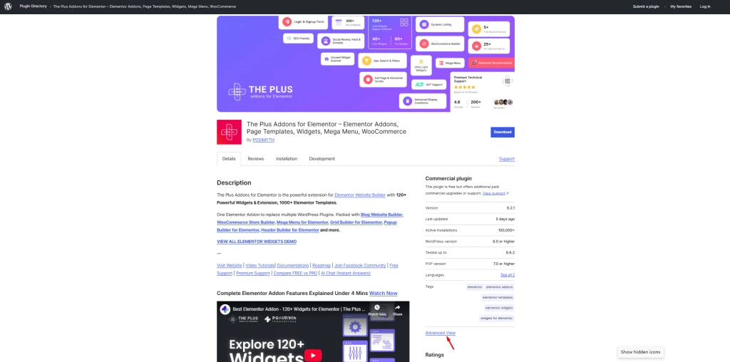 1. Go to this link or visit the WordPress plugin page of The Plus Addons for Elementor and click on Advanced View.