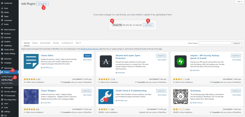 4. Once you have downloaded the old version, go back to your WordPress Dashboard from there, go to Plugins > Add New Plugin > Upload Plugin. Click Browse and upload your plugin, then click Install.
