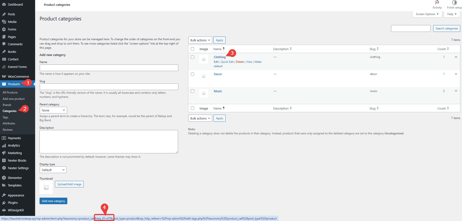 - Go to Dashboard > Products > Categories to find the product category IDs.
