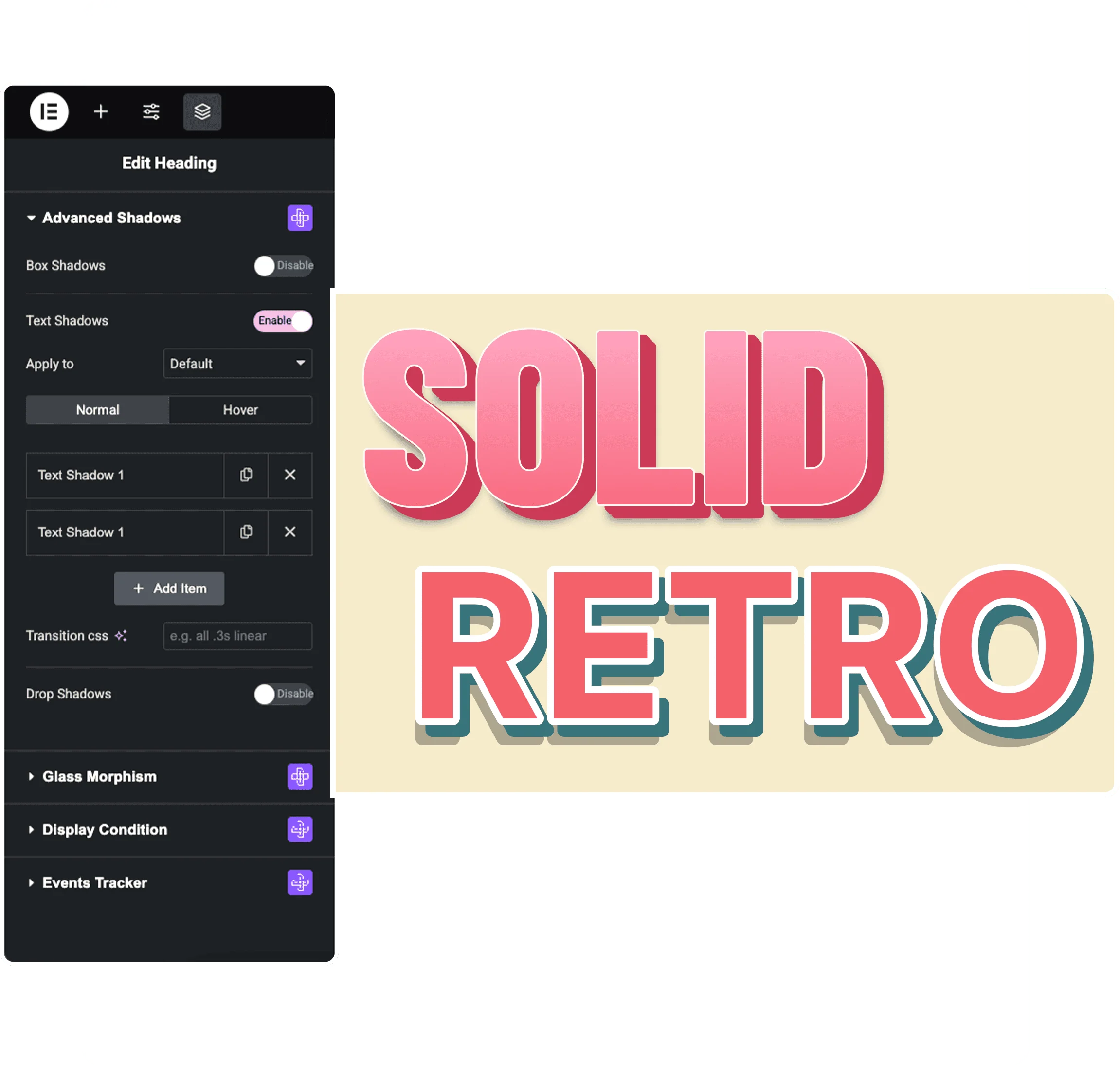 Add multiple layered box shadows to your Elementor sections, columns and widgets based on custom class setup.