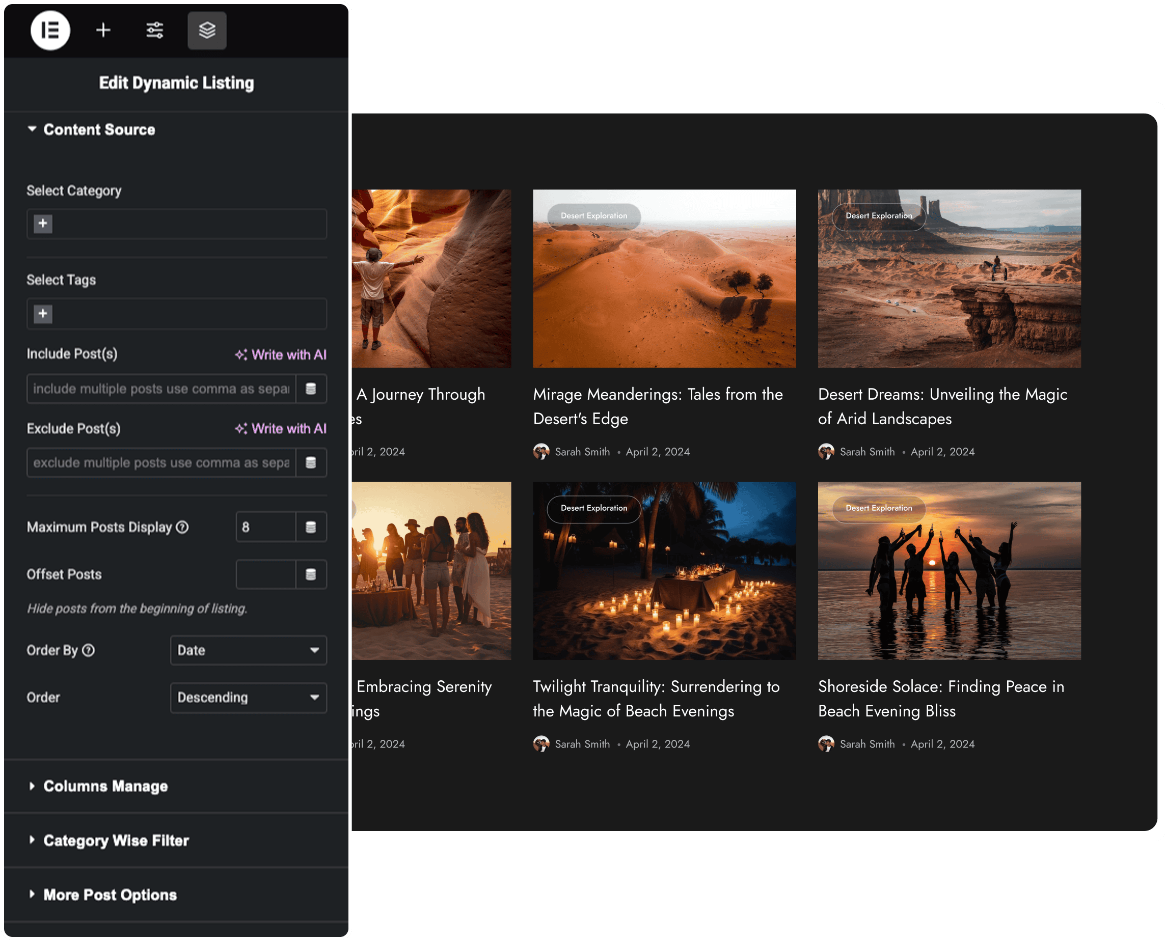 Sort posts by author, title, date, comment count and more in ascending or descending order for perfect layout control.