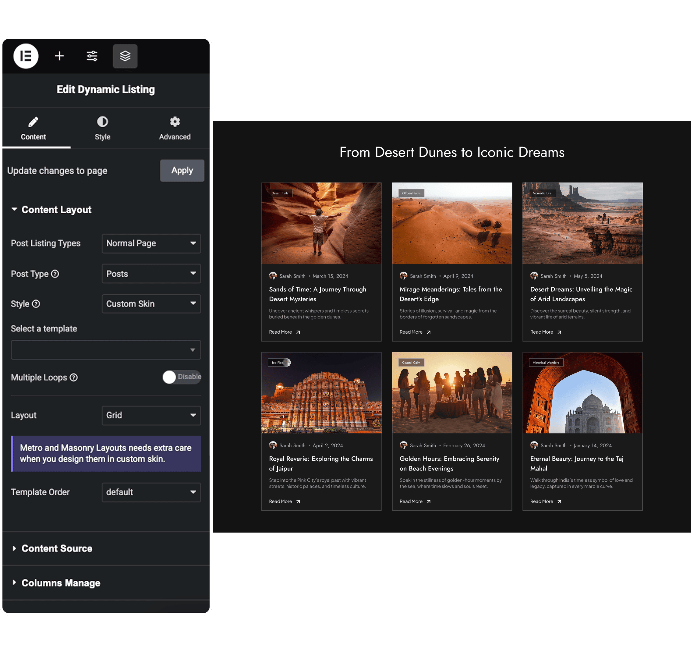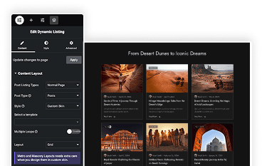 List your blog posts in any layout you prefer; our Blog Post Loop Skin Builder offers multiple options such as Grid, Carousel Slider, Metro Posts, and Masonry Layout.