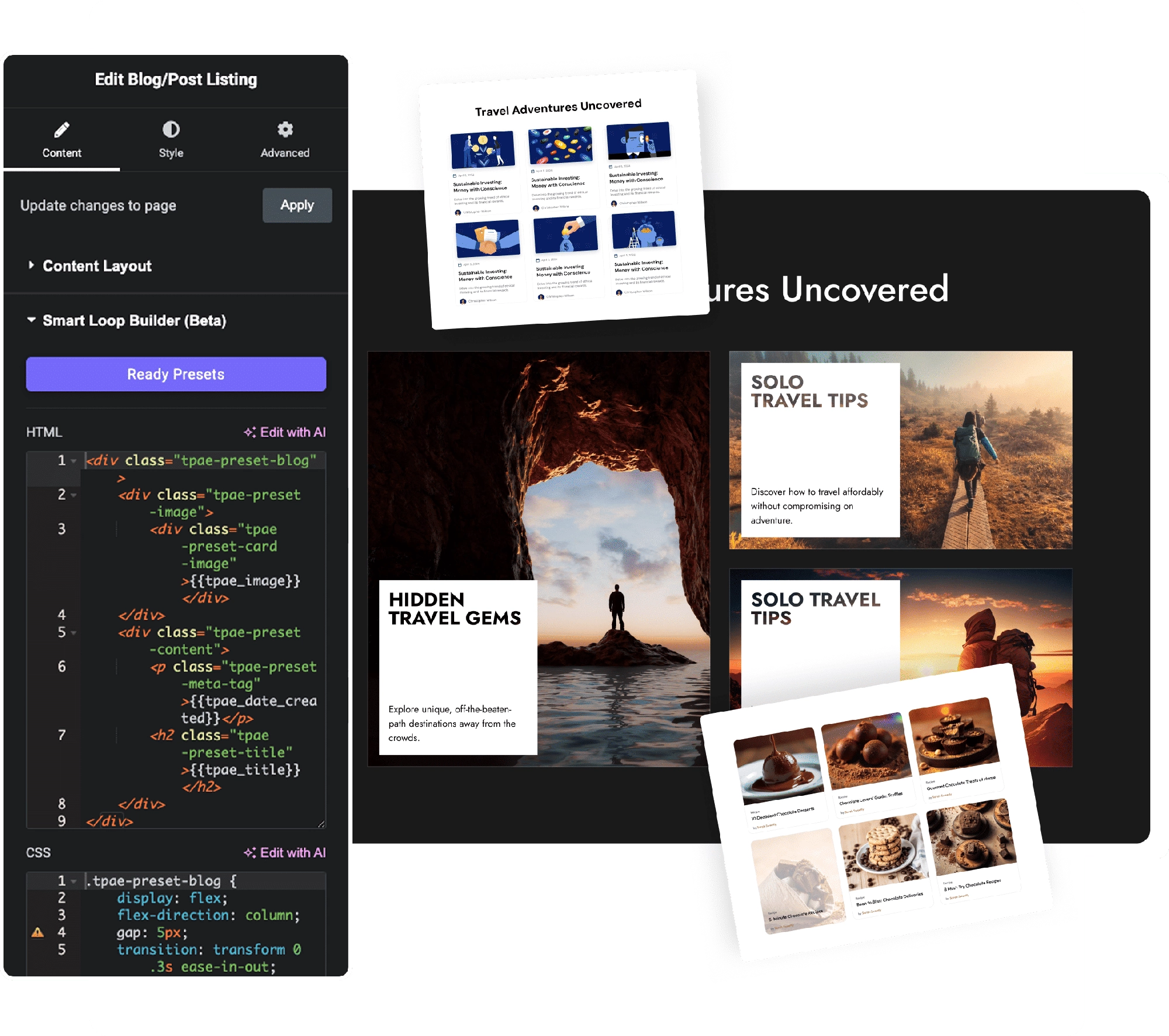 With our powerful Smart Loop Builder, easily transform any post into a captivating post loop, with full control over HTML and CSS. Create unique designs that will truly engage your audience.