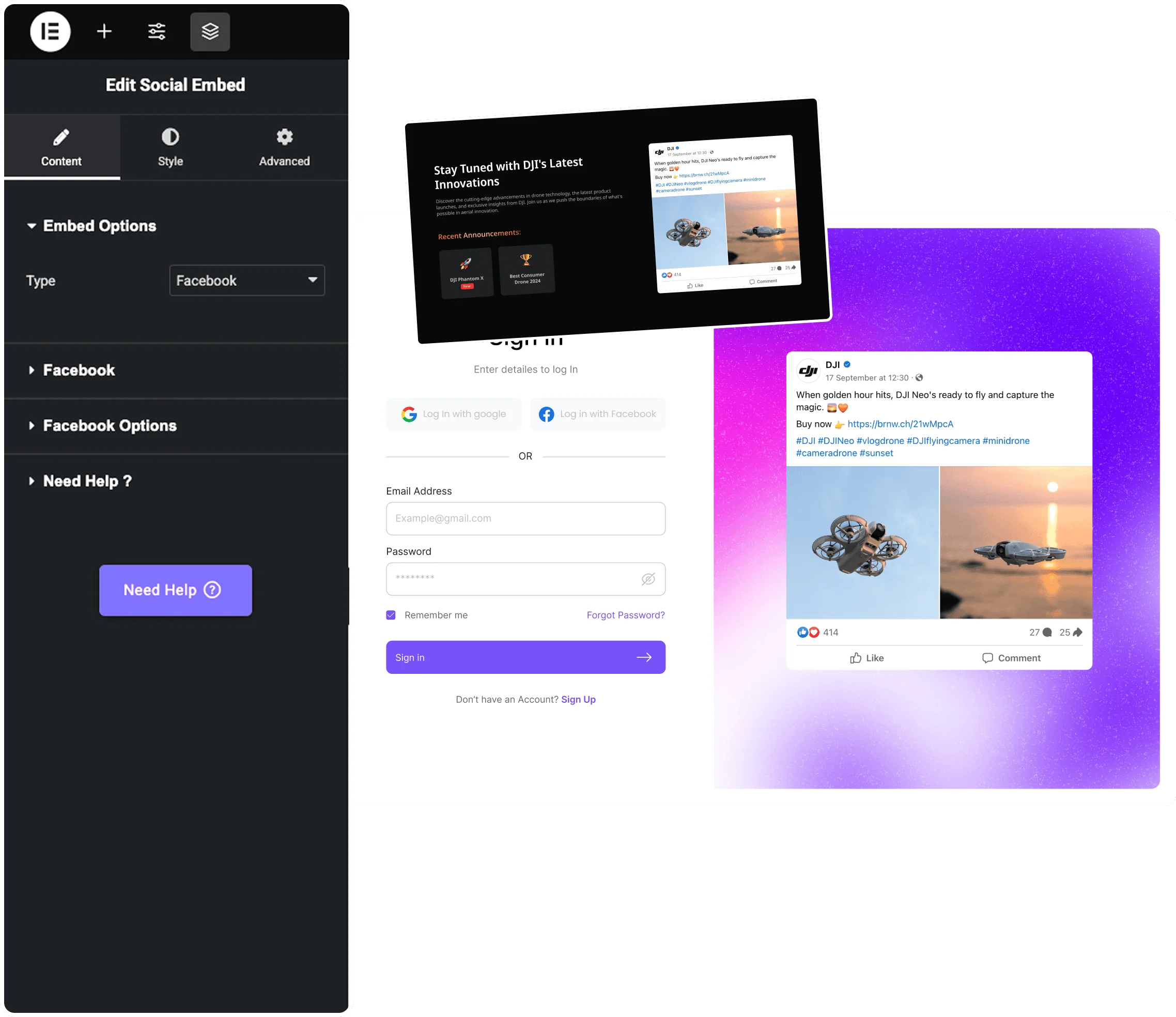 Add any video from facebook using id. Options of Autoplay | FullScreen | Captions | Height | Width